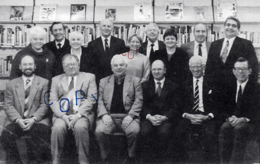 Back row, l-r: Mrs Eirlys Jones, Marteine Richards, Mrs Lynwen ap Gwynedd, Clr. T. Haydn Lewis, ?, John Adams-Lewis, Mrs. Rhian Sollis, D. Gatehouse, Clr D. M. B.Davies.