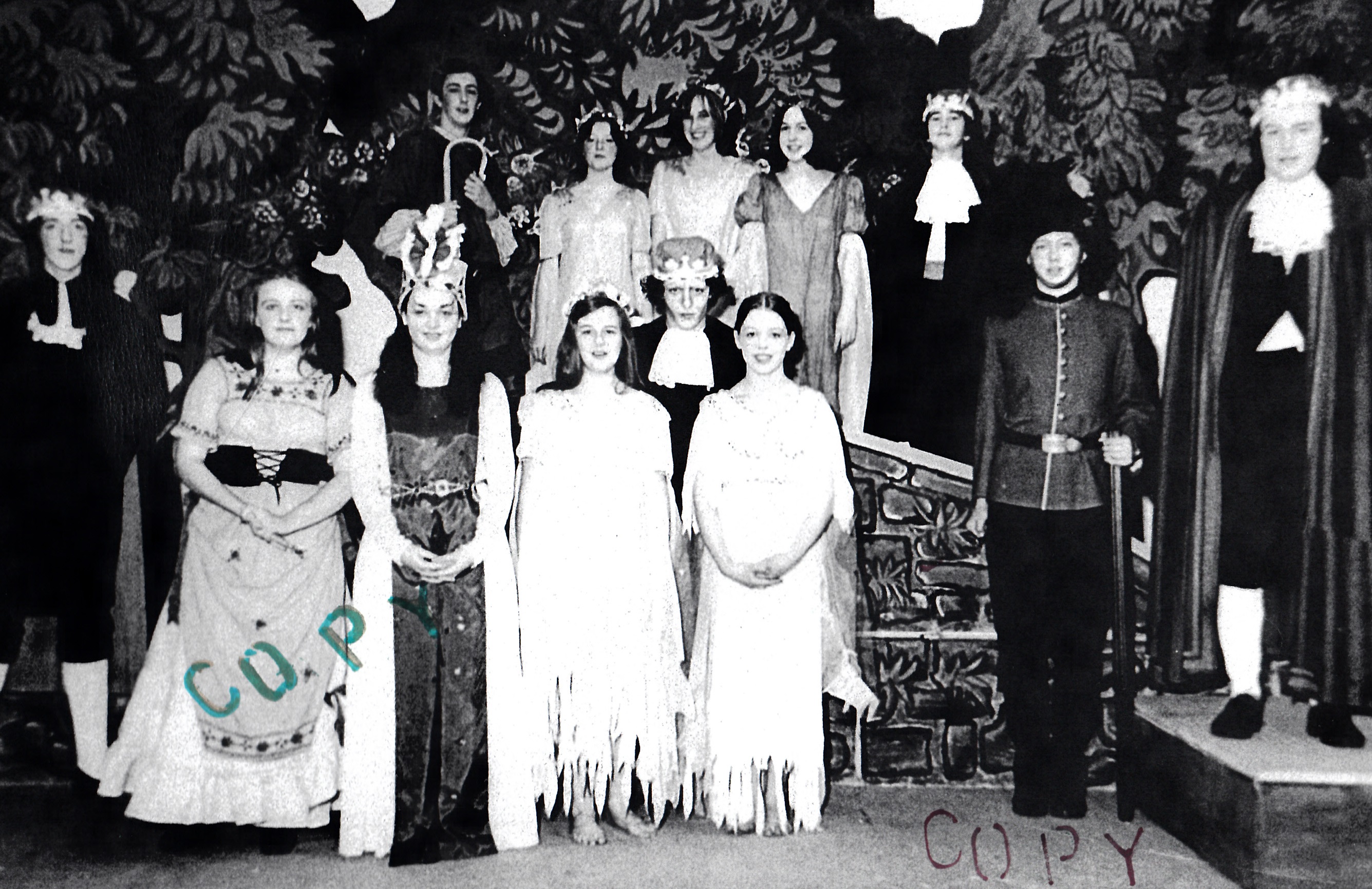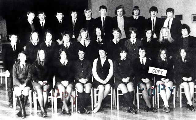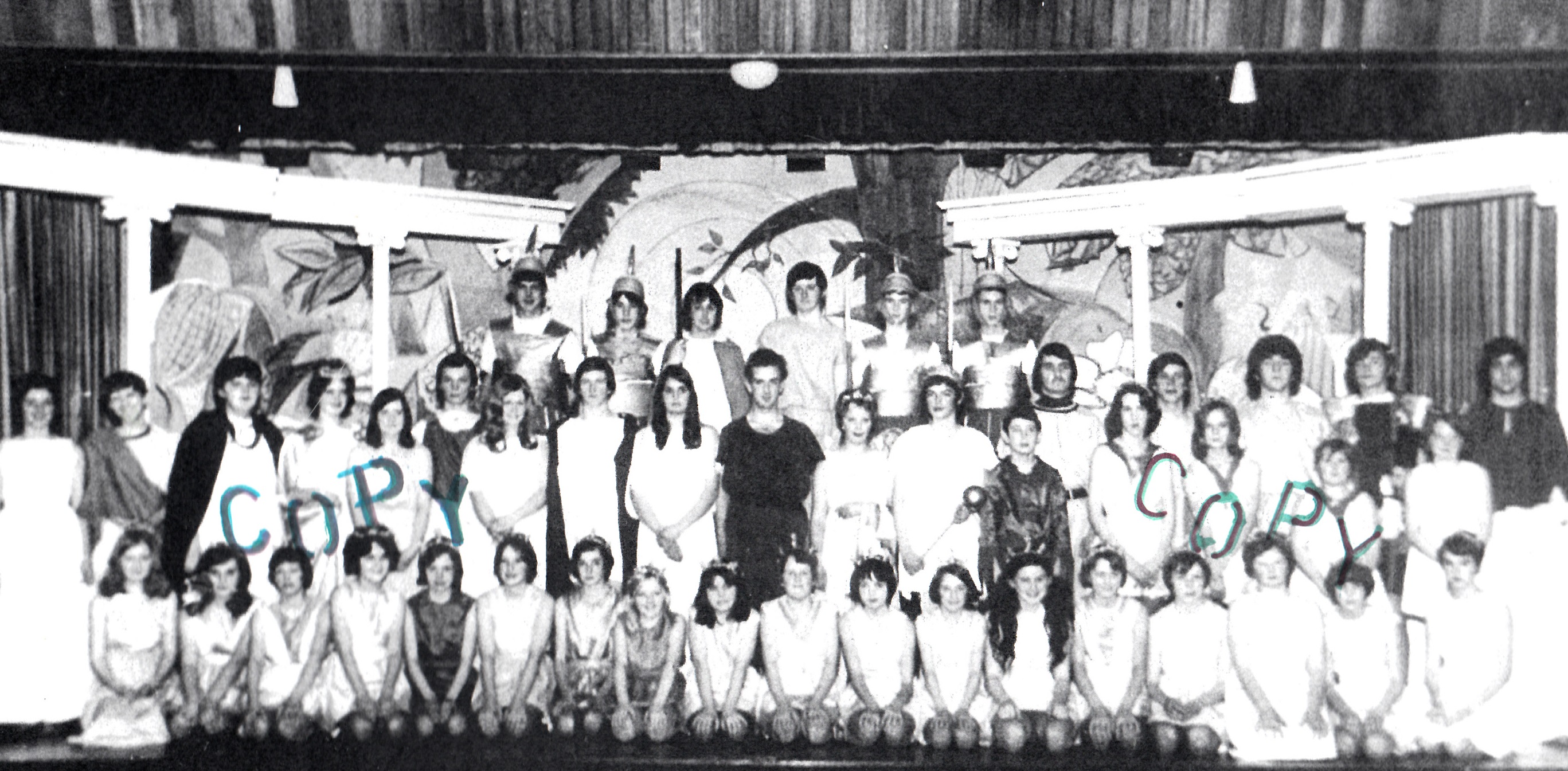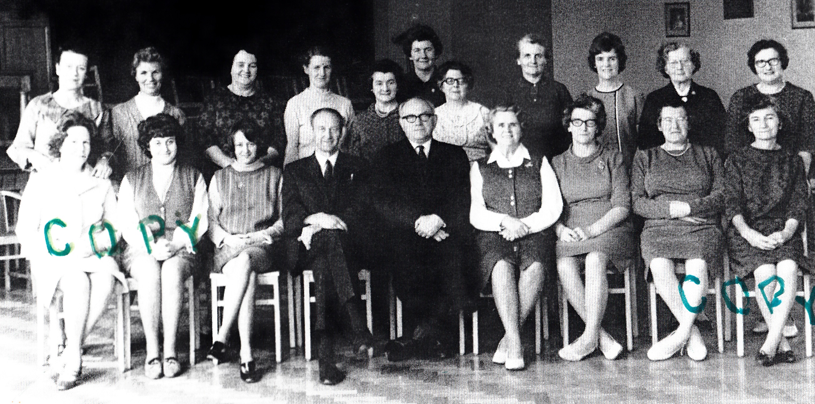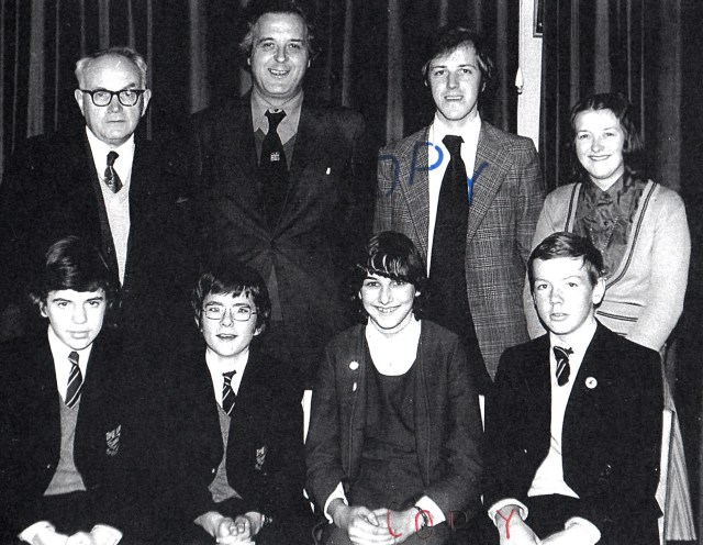 2nd row, l-r: Ann Jones; Marlene Davies; Ann ?; Dorothy Jenkins; Bethan Jones; Ann Thomas; Elaine Thomas; Dai Moses; Eryl Lewis; Reg Dyer; Russel Hume; John Adams Lewis; Trevor Evans; Graham Hope.