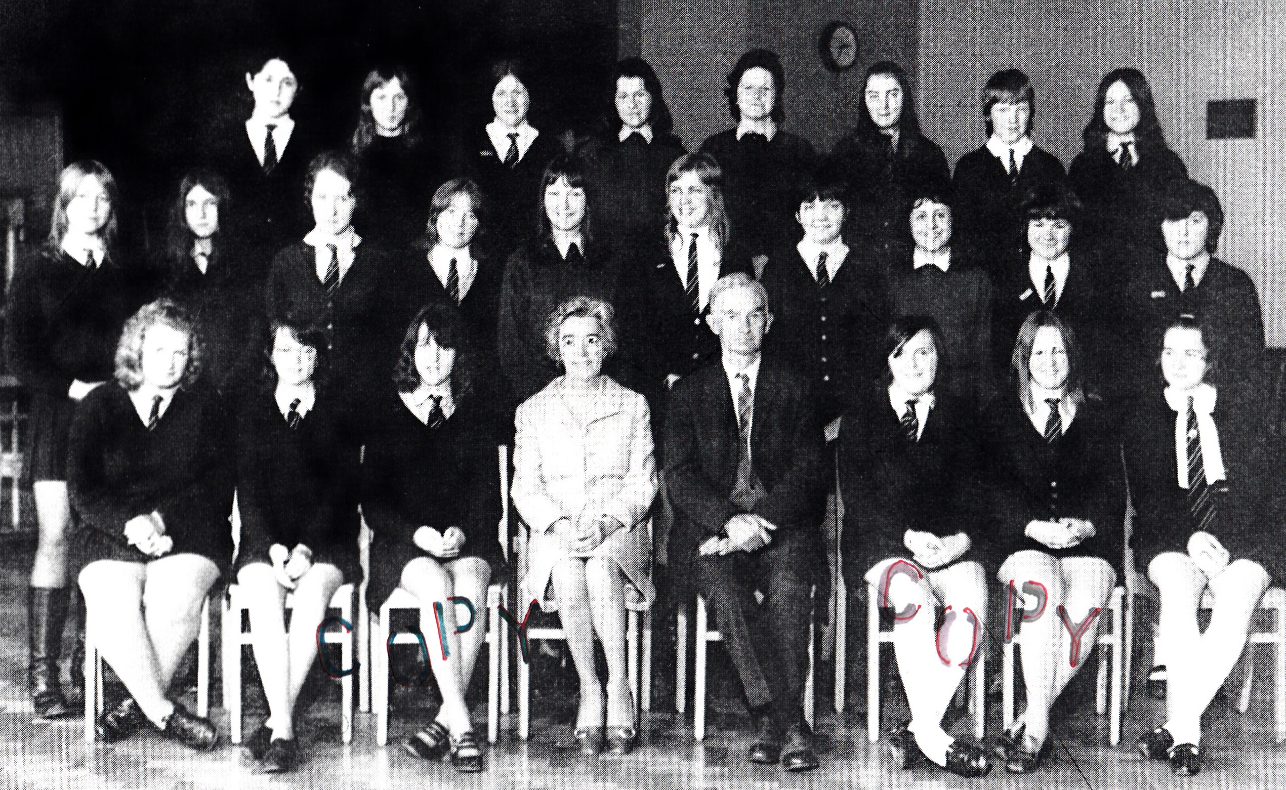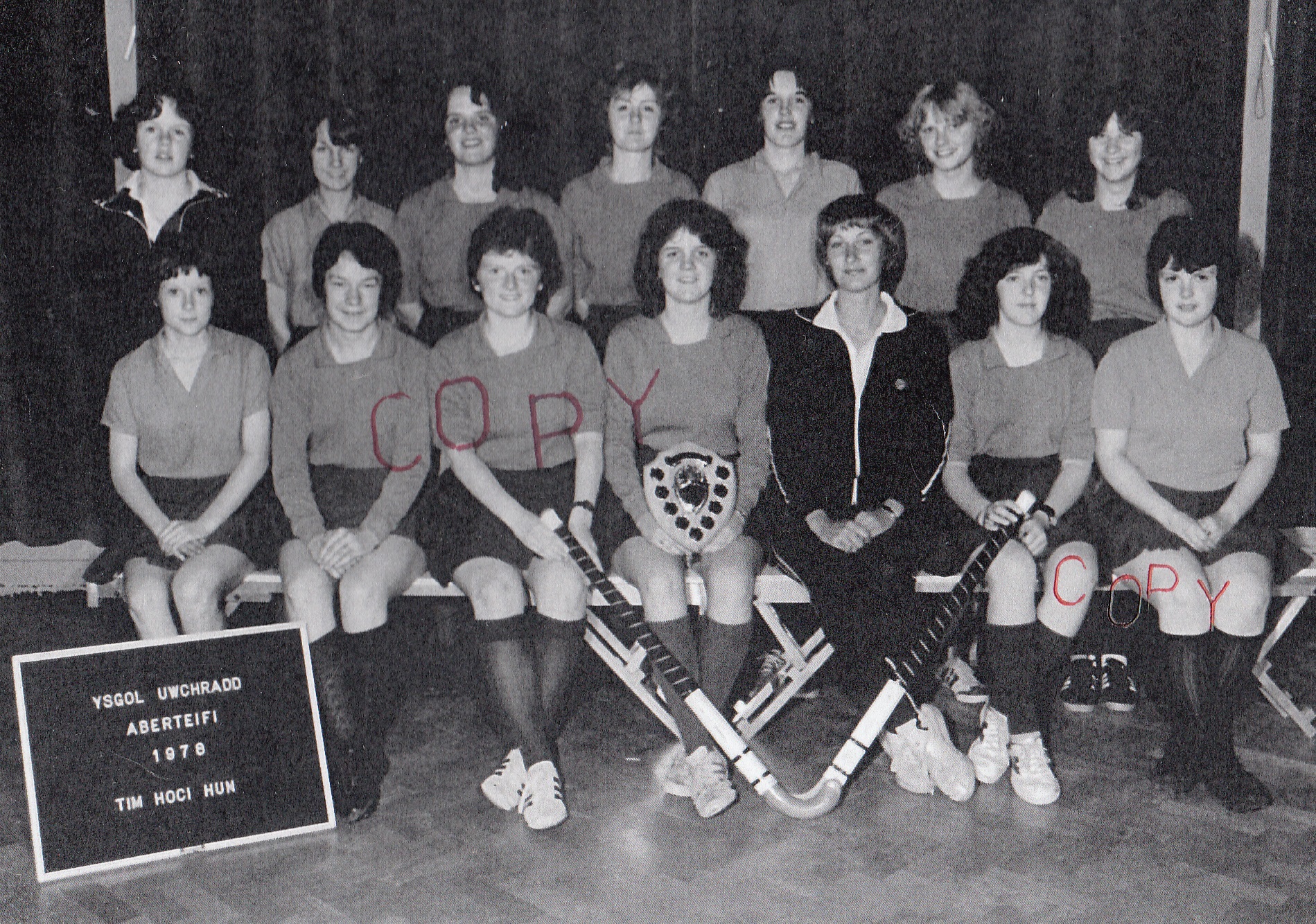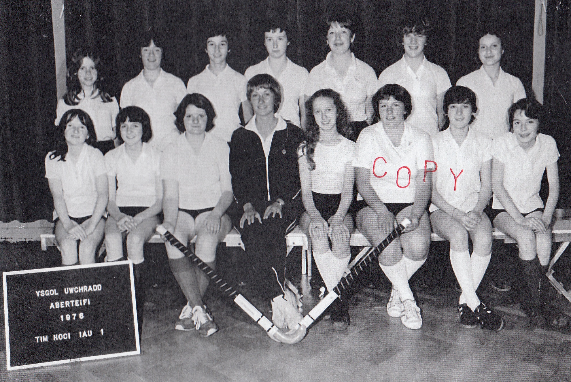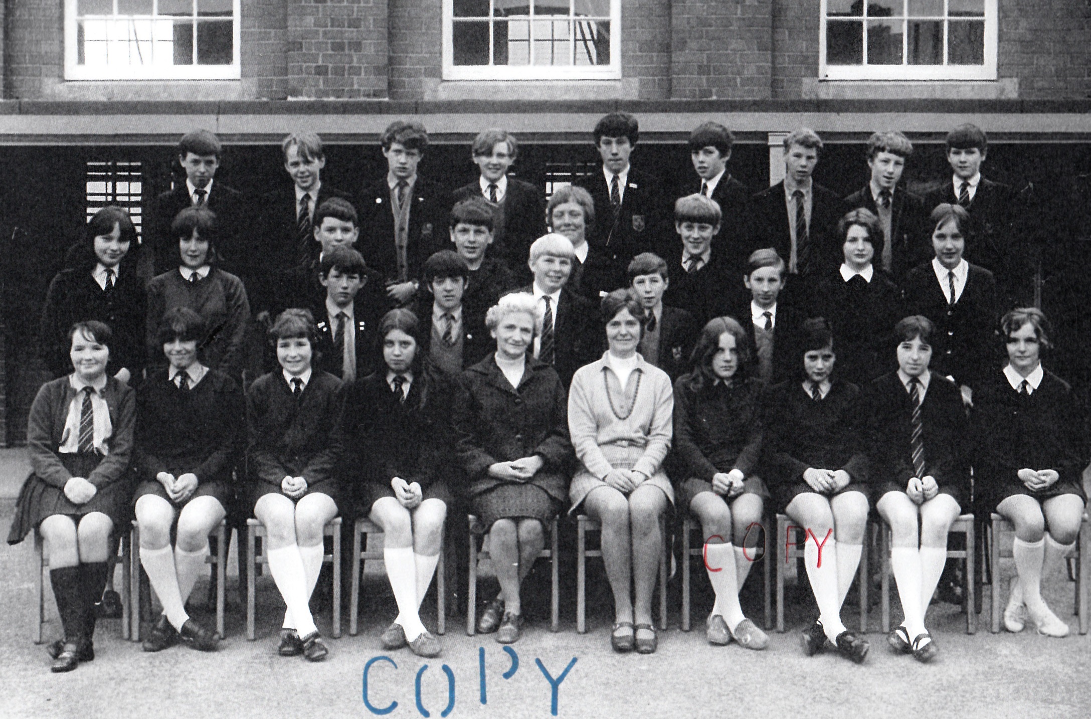 3rd row, l-r: Eiry Blake; Megan Roberts; Mrs Williams; ?; Mary Jones; Mavis Jenkins; ?; Lynette ?; Marilyn ?; Meriel Griffiths; June Powney; Nance Williams; Eryl Davies; Delyth Downey; Joy Jones; Alun Jones.