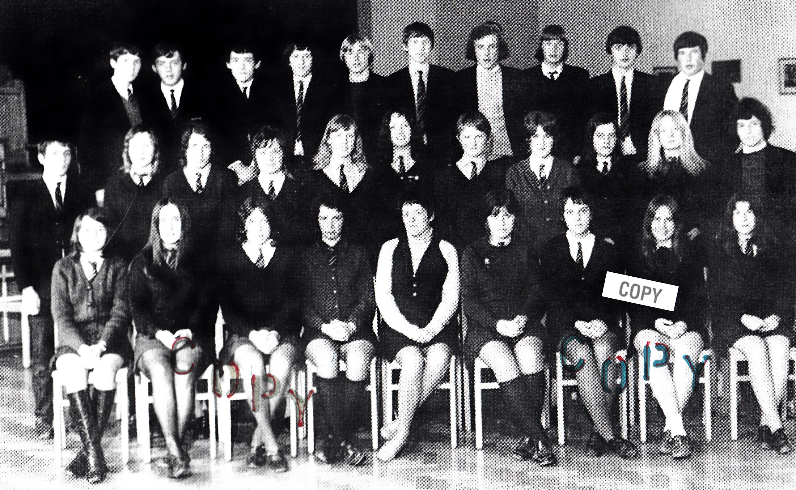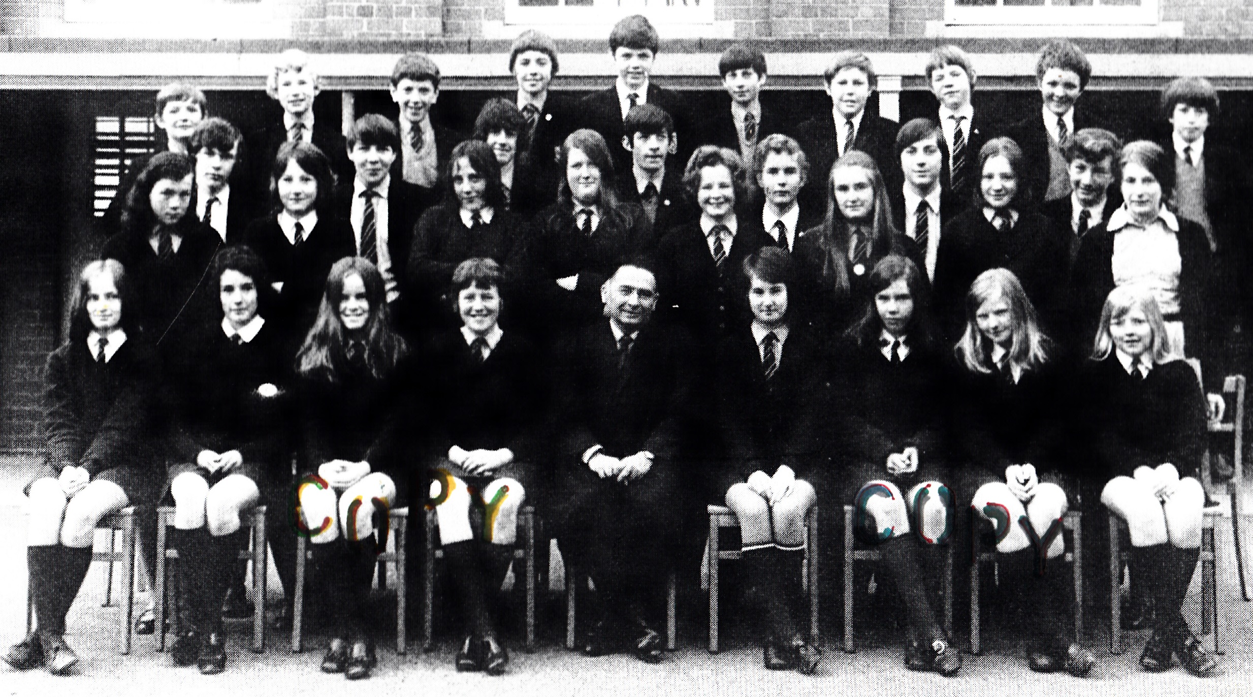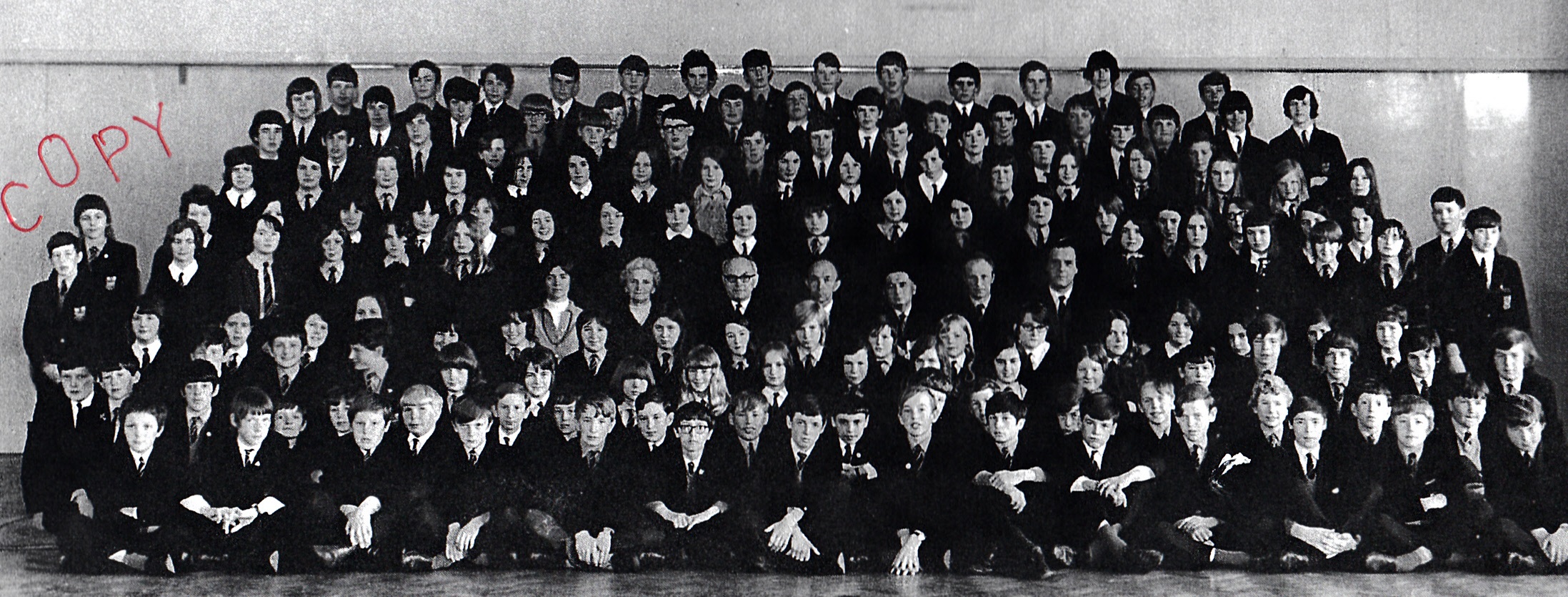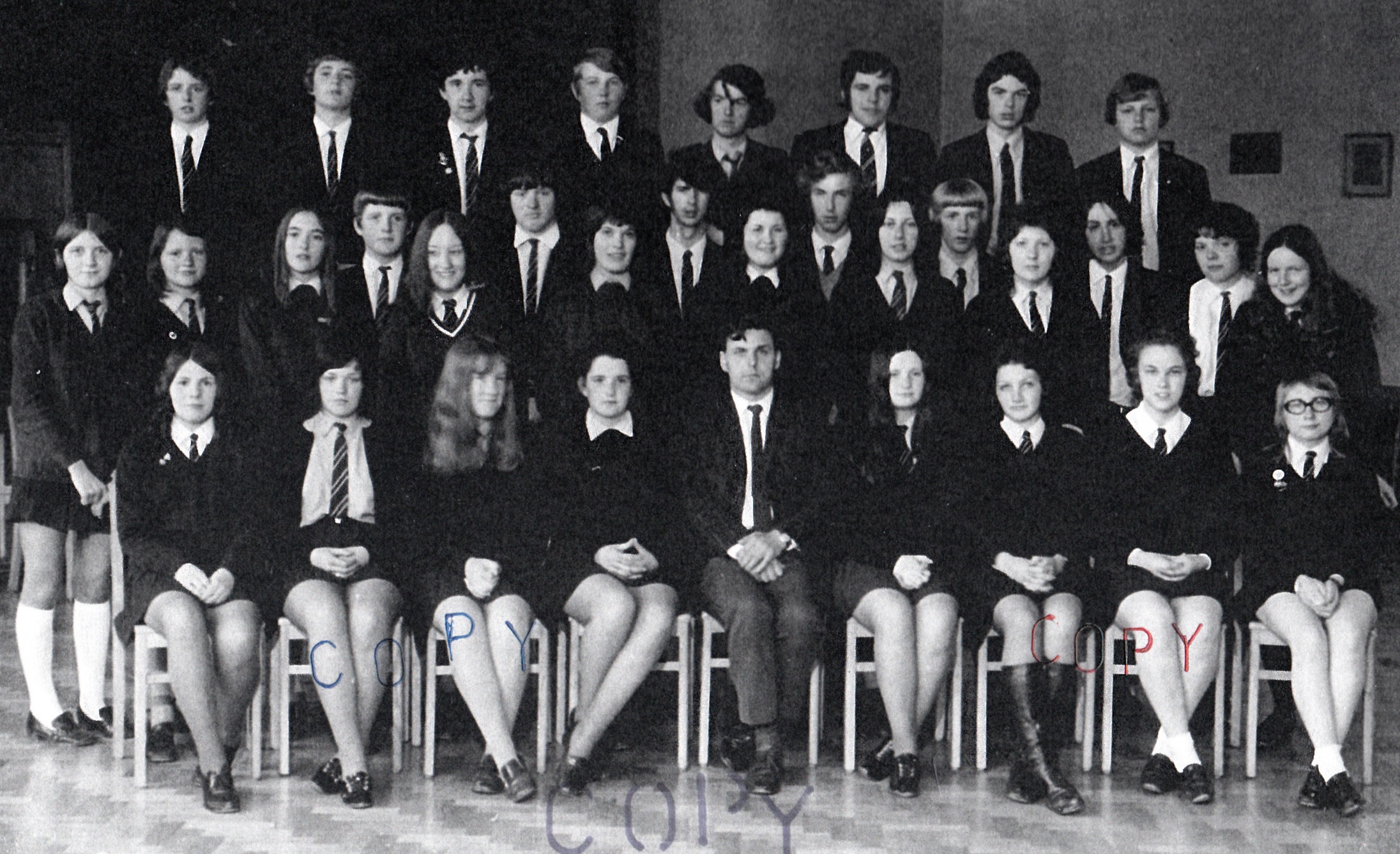3rd row, l-r: Eiry Blake; Megan Roberts; Mrs Williams; ?; Mary Jones; Mavis Jenkins; ?; Lynette ?; Marilyn ?; Meriel Griffiths; June Powney; Nance Williams; Eryl Davies; Delyth Downey; Joy Jones; Alun Jones.