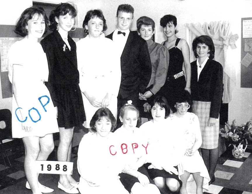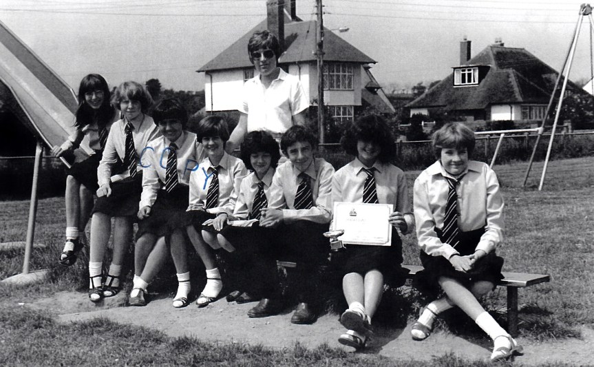 From the back to the front: Eleanor Harries, Emma Walsh, Susan James, Jackie Morris, Donna Dunett, ?, Kevin Moses, Hayley Stephens, Julie Harries. The teacher is Rhiannon Davies.