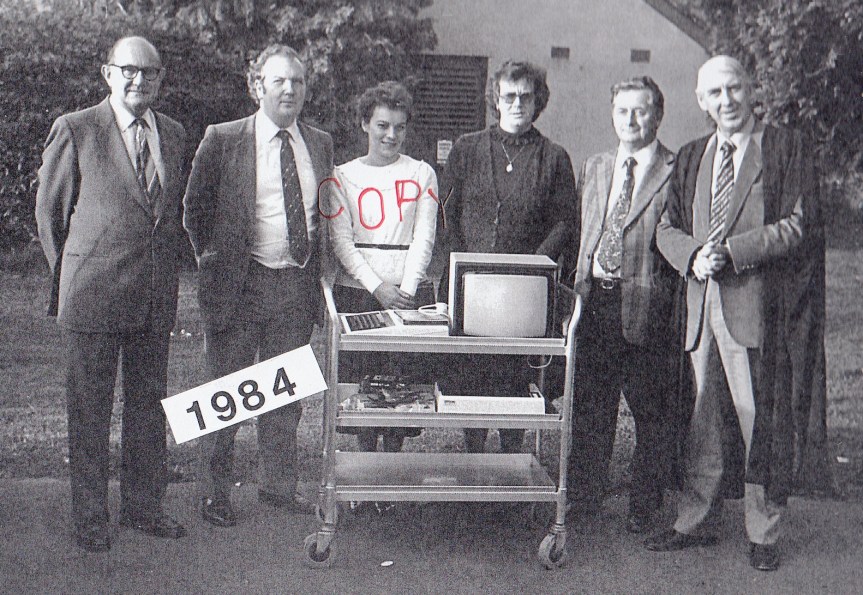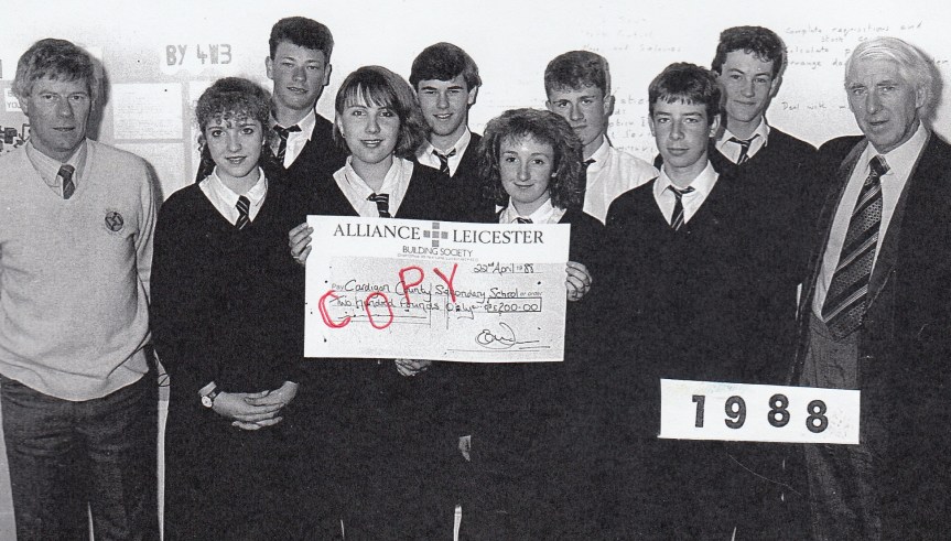 Left-r: Ruth Harries, Lance Reed, Vivienne Pritchard, Kevin Moses, Amanda Selby, Dewi Lloyd, headmaster.