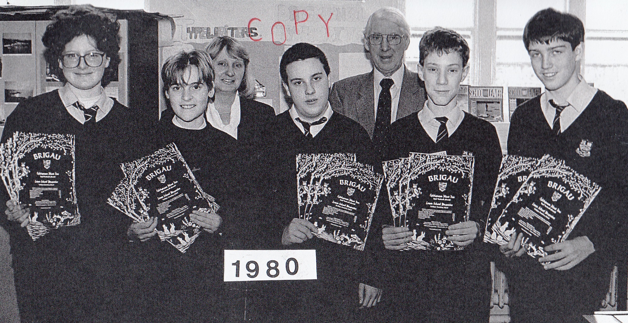 Left-r: Ruth Harries, Lance Reed, Vivienne Pritchard, Kevin Moses, Amanda Selby, Dewi Lloyd, headmaster.