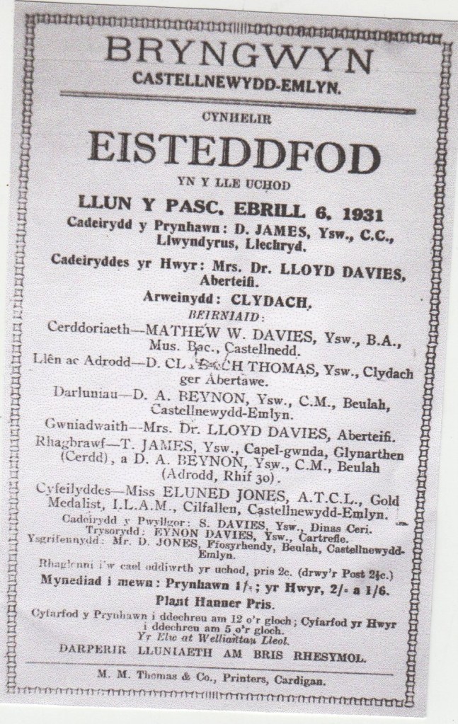 3 1949 (Thurs.) Drama Festival with Ceredigion’s most famous drama groups. Y Pibydd yn y Maes, T. C. Murray; trans. by Nan Davies with Gwmni Aelwyd Aberystwyth; Y Ty ar y Rhos, Amy Parry-Williams with Cwmni Talybont; Adar o’r Unlliw, J. O. Francis with Gwmni Beulah (T. Tegryn Davies). Also two one act plays by St Mary’s Cymry’r Groes: The Other side of the wall, P. M. Bentley; and Uncle Joseph, J. B. Trenwith.