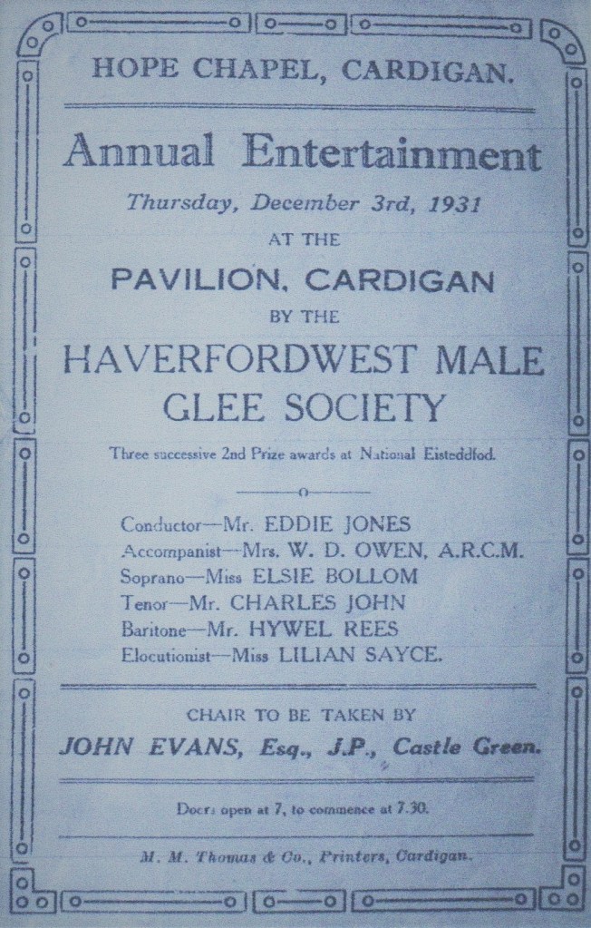 Compere T. Tegryn Davies. Stage organisers : Fred Lewis, Garfield Thomas, Lemuel Morgan.