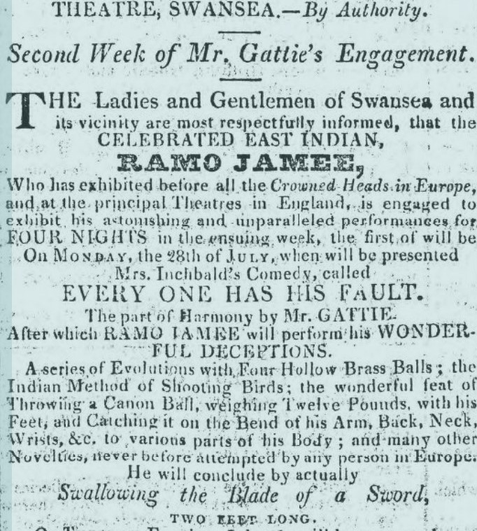 In July 1823 he performed in Swansea as this advert in The Cambrian shows: