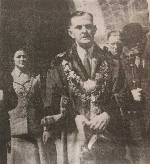 Mayor of Cardigan, Mr Tom Evans M.A., J.P, headmaster of Cardigan Grammar School addressing the public from the steps of the Guildhall during VE celebrations. Also pictured is Mrs Peggy Evans, mayoress.